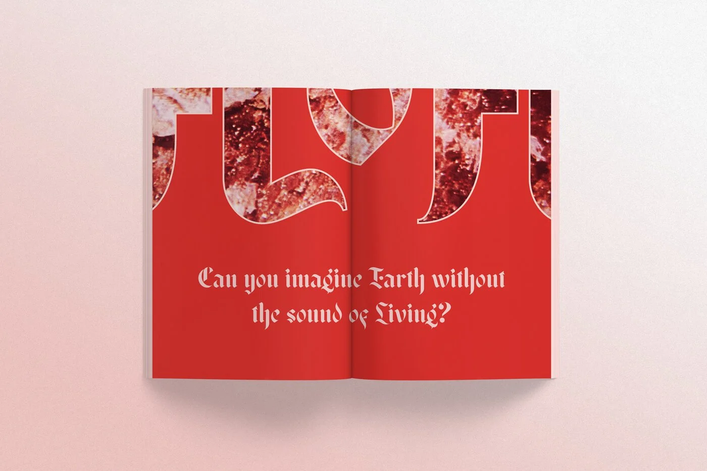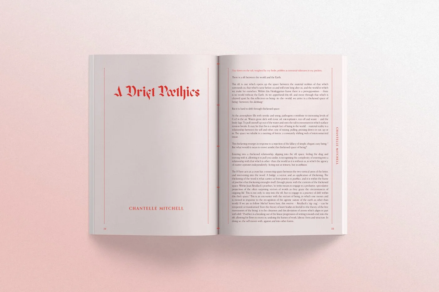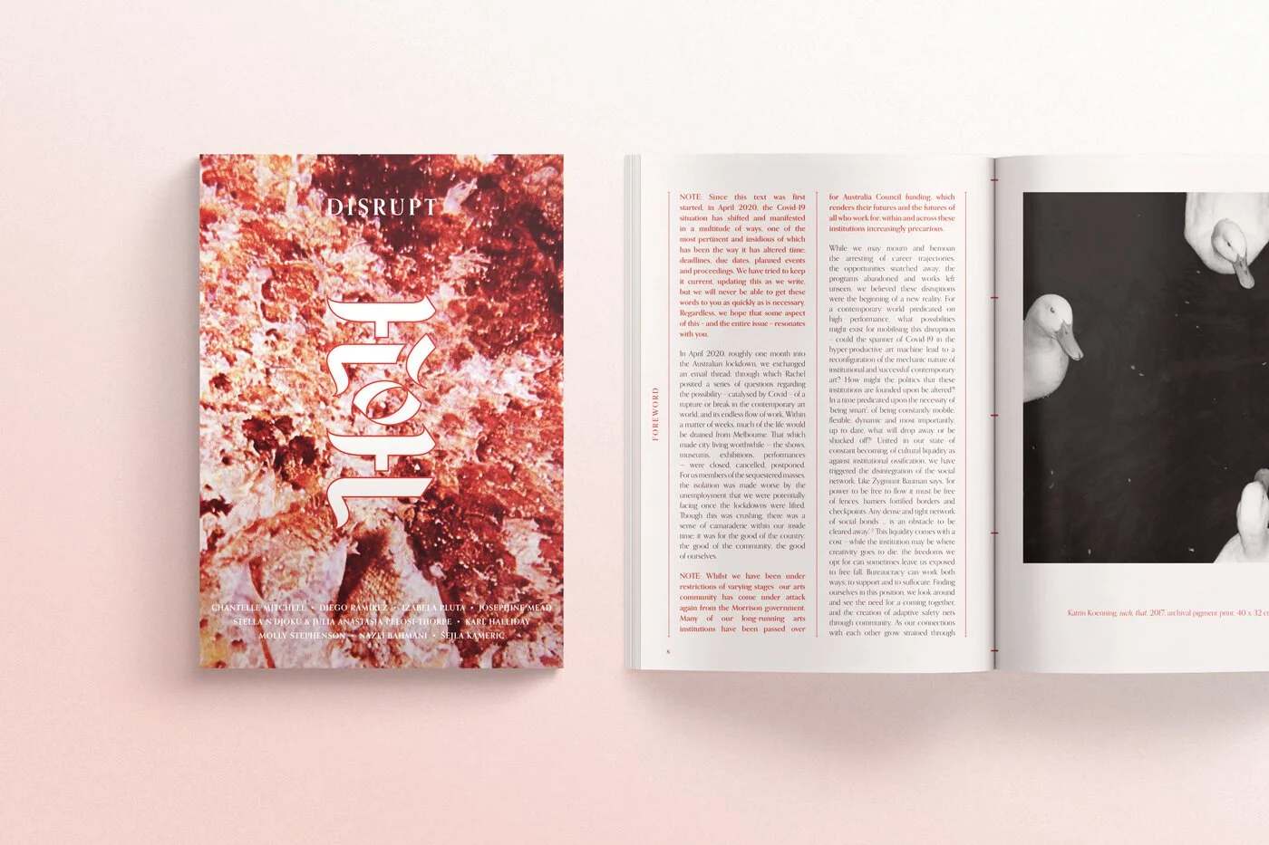 The journal’s cover image represents the chaos of disruption and the soft pink and red adds a sense of intimacy representing the personal, reflective nature of the artist’s work. I tore the image from an old National Geographic from the 1970’s (I collect them secondhand) before manipulating, recolouring and abstracting it digitally to create a texture that could be used throughout the pages.