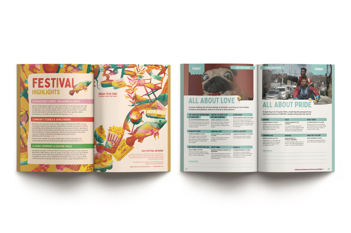 To bring this all together I handpainted 35 illustrations, these were then digitally manipulated and rolled out across the entire suite of the festival’s collateral in many different arrangements and colour schemes to reflect the different activations.